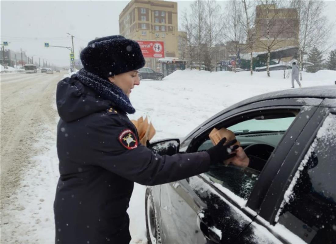 На одной из оживленных улиц города они останавливали автомобили, но не для проверки документов, как это обычно бывает, а для того, чтобы поздравить водителей с наступающим праздником.